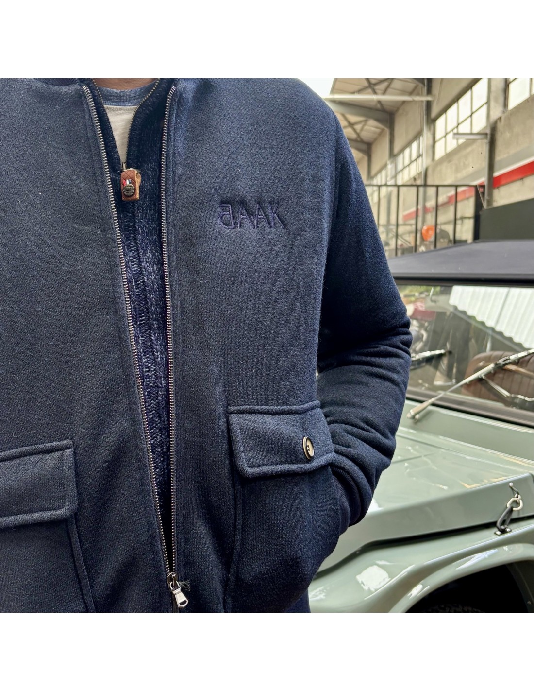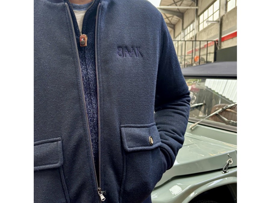 A bomber with a confident silhouette, crafted in Italy. Its BAAK embroidery at the heart embodies refined elegance, while the optional personalized back version celebrates your individuality. The delivery time for the "with embroidery" option is 10 days.