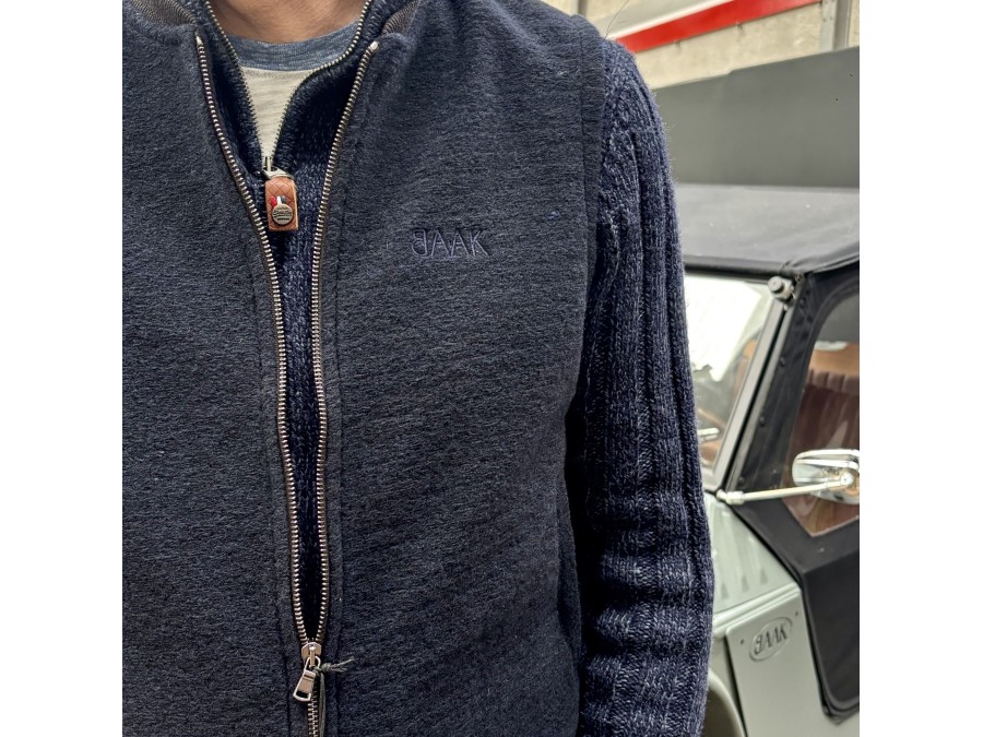 This deep blue sleeveless vest embodies the meeting of Italian craftsmanship and Lyonnais artisanal expertise.